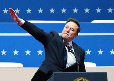 今年1月,在一场庆祝特朗普重返白宫的演讲上,情绪激动的马斯克举起右手手掌拍至胸前,随后手心向下,向其右上方伸展手臂。